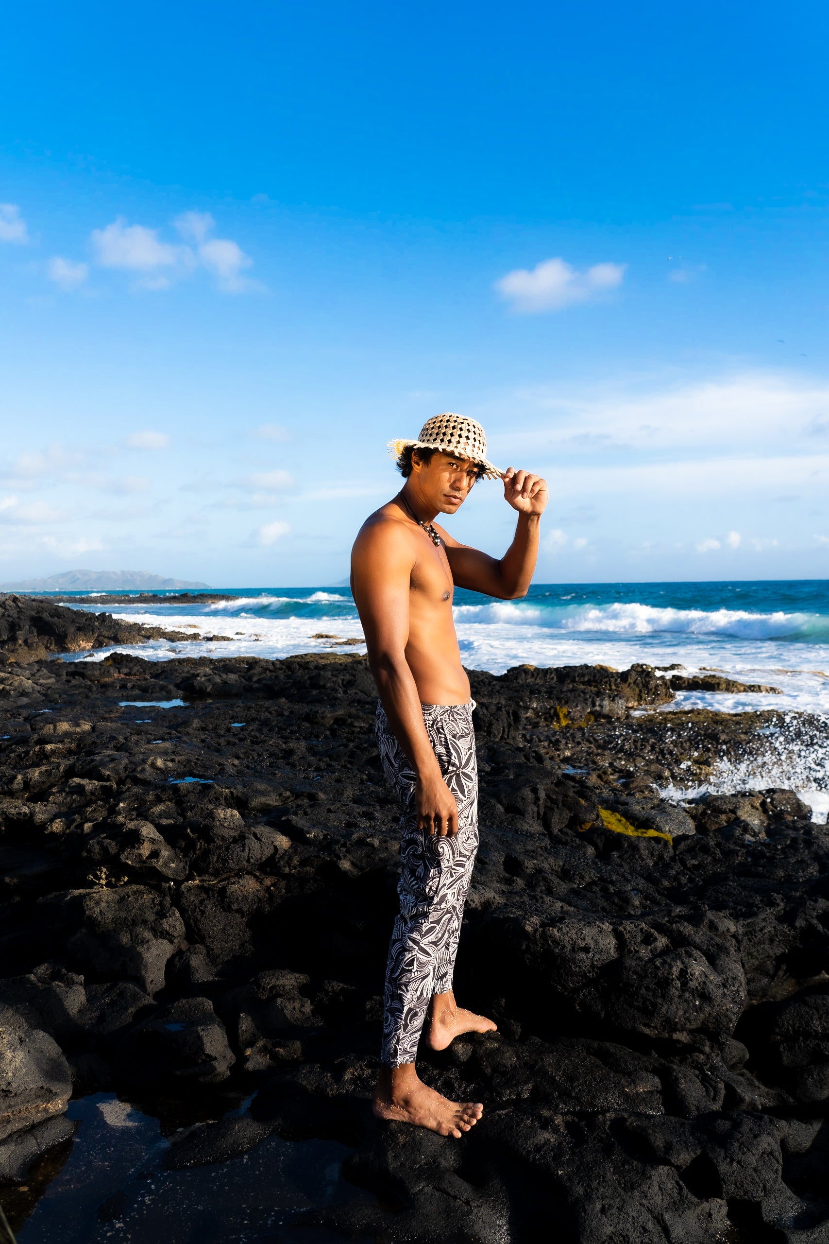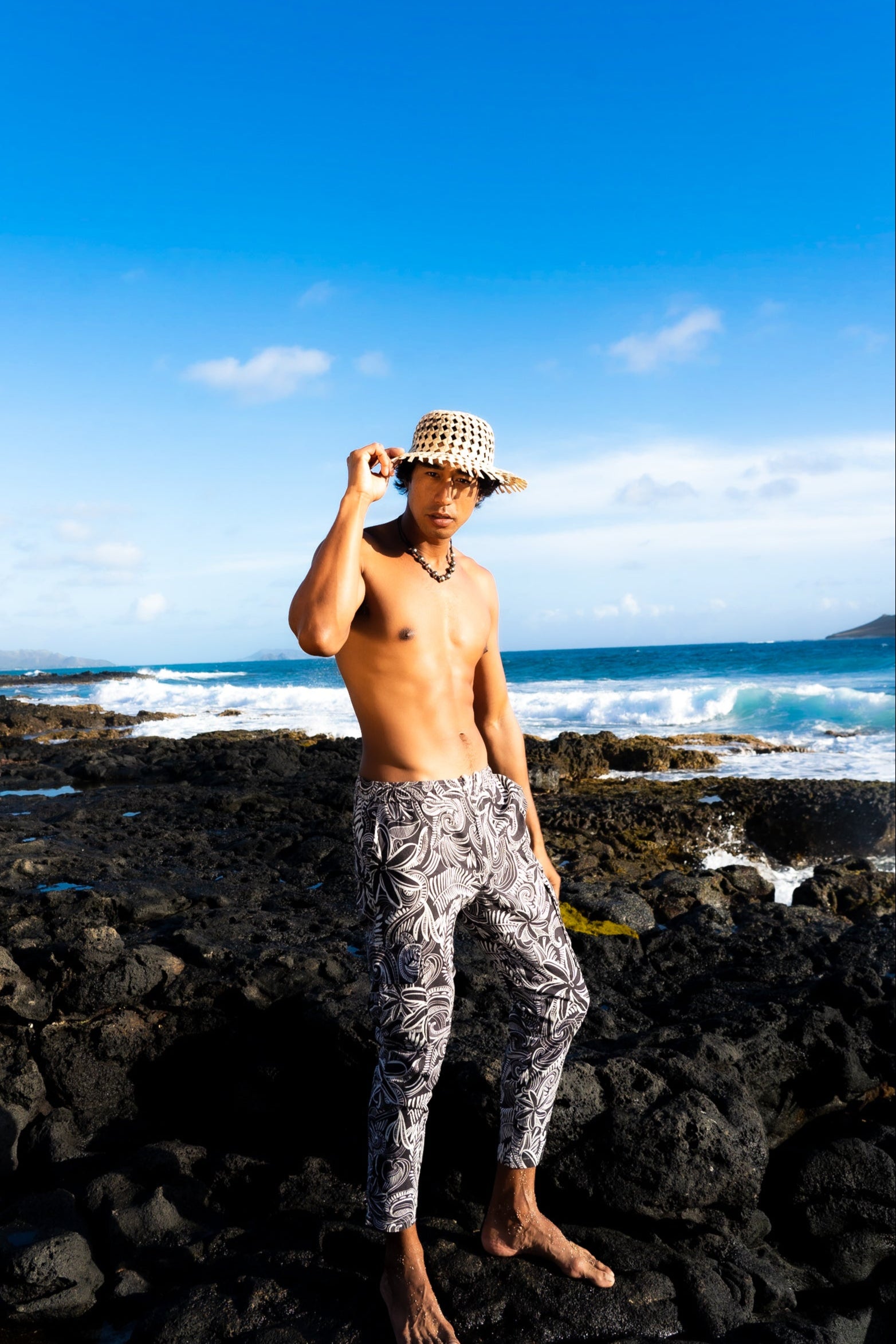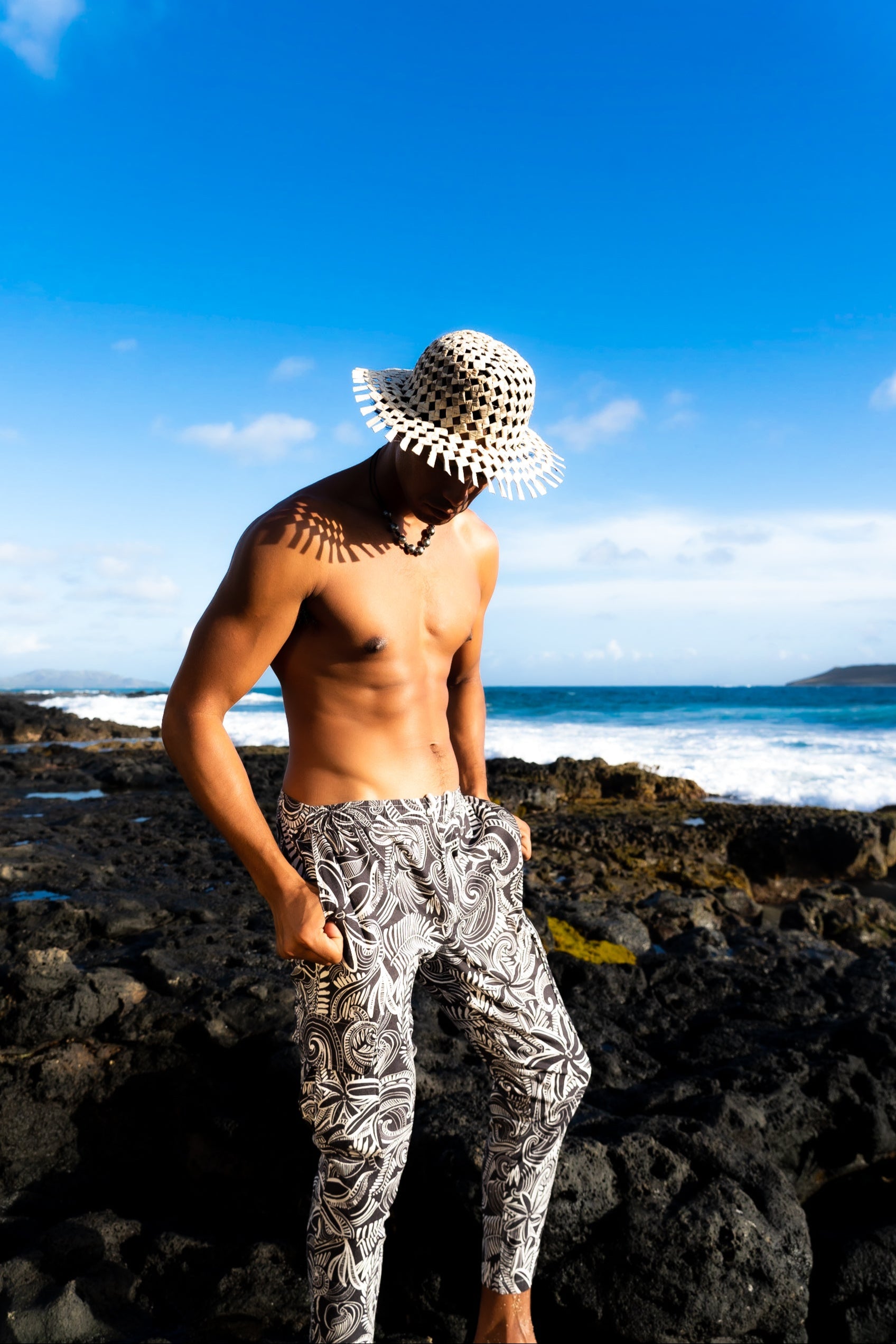 Made from cool linen with a little spandex to give comfort these pants will quickly become your favorite summer pants. The tribal print makes them uniquely Polynesian and sets these apart.